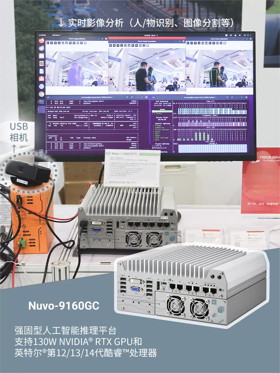 展台上,Nuvo-9160GC连接了高清USB相机,对现场拍摄的画面进行实时物体和人物姿态识别分析。