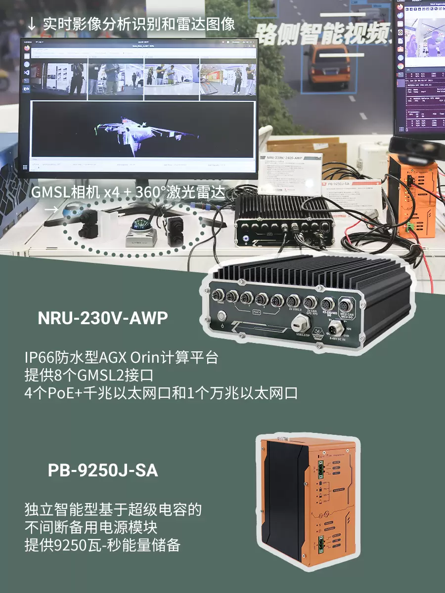 在现场,NRU-230V-AWP同时连接了4个GMSL2相机和1个激光雷达,可以对相机拍摄的实时画面进行识别分析,同时还能对激光雷达采集的画面进行实时呈现和数据采集。NRU-230V-AWP不仅拥有IP66防水防尘等级,也是一款基于NVIDIA Jetson AGX Orin的人工智能计算平台,支持8个GMSL2相机并提供M12接口用于连接各类I/O。NRU-230V-AWP内部集成了1个系统监控端口,采用车规级MCU,非常适用于自动驾驶应用,包括Robobus、自动驾驶矿车、智慧农业等。