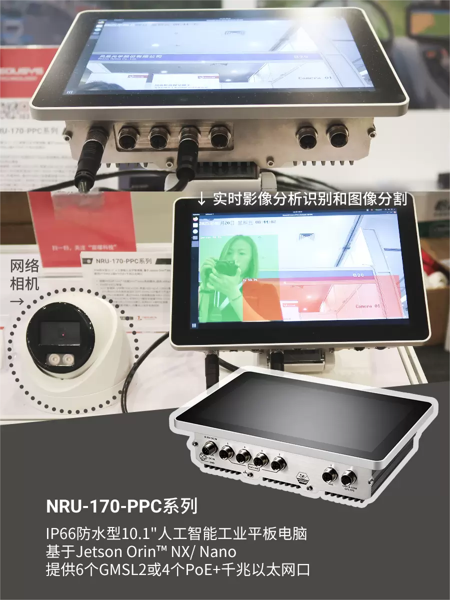 NVIDIA Jetson系列AI计算平台/采集卡是本次展览的另一亮点。IP66防水型10.1″人工智能工业平板电脑NRU-170-PPC搭载了网络相机,自带高达100 TOPS AI算力,采集实时画面的同时能够实现图像分析识别和分割。