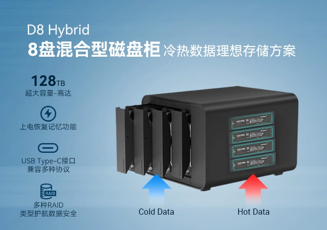 而 D8 Hybrid 作为业内首款冷热存储组合硬盘柜,4 个 SATA 盘位支持 3.5/2.5 英寸硬盘,单个 SATA 盘位最高可兼容 24TB 机械硬盘,用于存储访问频率低的冷数据,如企业历史业务档案、长期备份数据等;4 个 M.2 NVMe 盘位,单盘最高 8TB 容量,专为高频访问的热数据打造,像企业实时办公文档、影视后期工作室的剪辑工程文件等 。总存储容量高达 128TB,足以应对大型企业、专业影视制作公司等对存储容量的严苛要求。