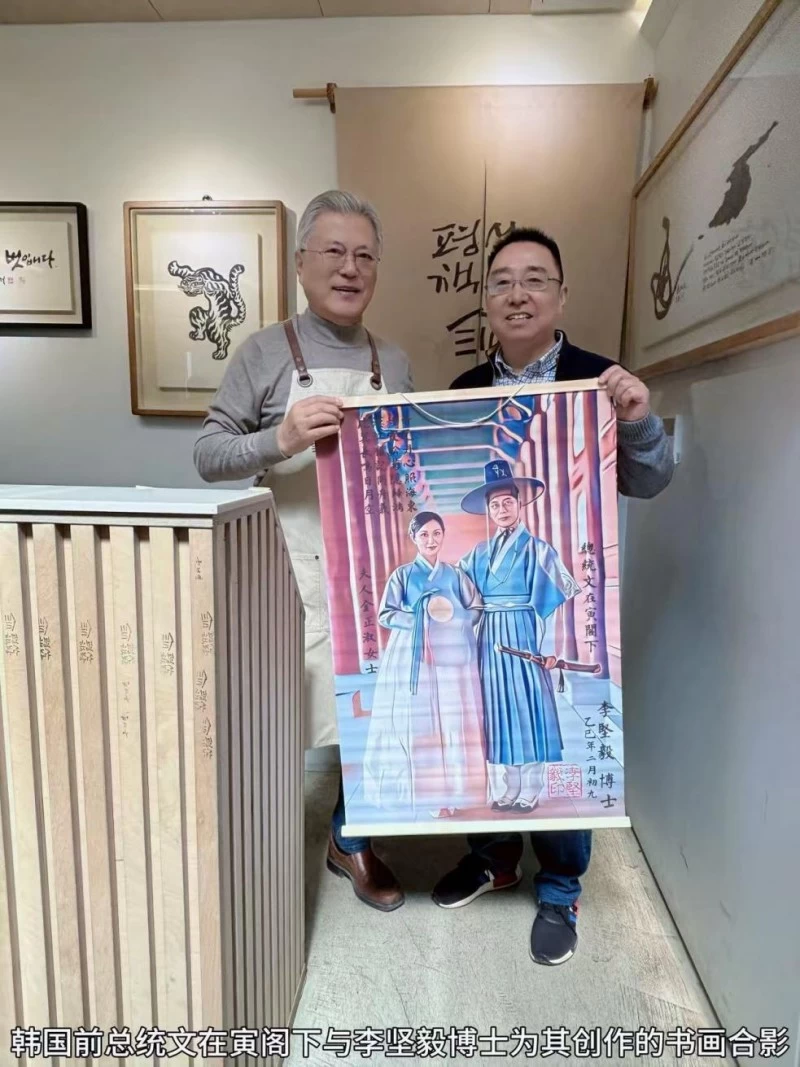 在国际学术与社会活动中,李坚毅博士获得多方关注。多位诺贝尔科学奖项得主、欧亚数国王室成员,以及联合国秘书长安东尼奥·古特雷斯、时任欧盟委员会主席乌苏拉·冯德莱恩等多国政要纷纷致信问候。李博士曾以韩国传统体裁为韩国前总统文在寅夫妇创作画像并题写原创诗词,文在寅阁下与画像合影留念,李坚毅博士还获得文在寅阁下的中文版回忆录,见证跨文化交流成果。此外,李坚毅博士还荣获2024年度亚洲青年领袖奖,进一步肯定其在青年群体中的引领作用。