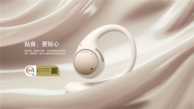 耳机采用液态硅胶材质,是首款通过了SGS亲肤友好金标认证的耳机,这是与奶嘴同款的抗过敏材料,亲肤柔软,敏感肌也能放心使用。镍钛记忆合金耳挂,具备高弹性和强耐用性,即使在运动时狂甩,耳机也不会脱落,让佩戴更加稳固可靠。
