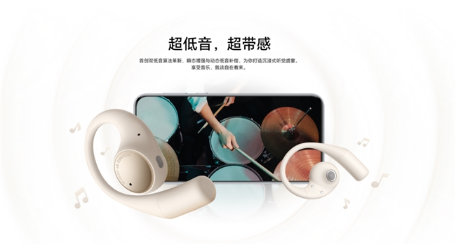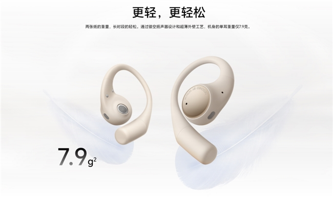 佩戴体验方面,荣耀Earbuds开放式耳机采用非入耳设计,既可享受音乐,又能感知周围环境,安全又舒适。产品单耳仅7.9克,仅相当于两张纸的重量,搭配镂空扬声器和超薄外壁工艺,久戴无负担,基于人因工程学原理,受力均匀分布,即使全天佩戴,耳朵也不会有压迫感。对于戴眼镜的用户来说,荣耀Earbuds开放式耳机的纤细耳挂设计,能与镜腿和谐共存,佩戴时毫无异物感。