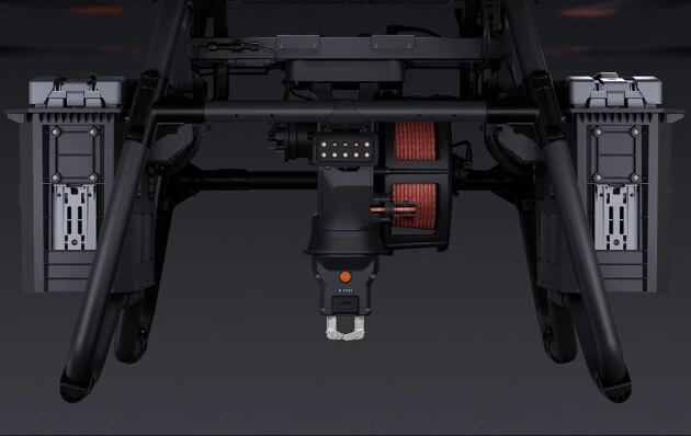 空吊系统旗舰版由分体式双电脚架、双电机模式卷扬机、电动开合的主动挂钩构成。分体式双电脚架支持快速拆装和单、双电池的灵活切换。卷扬机则采用全新双电机收放结构,收放绳索自如;配备30米绳长,重载时也能实现1.2米/秒的高速收放。货物近地时可自动减速,挂钩远程控制打开,高效安全。如发生意外缠绕时,无需熔断,可一键释放空吊绳,即可弃绳脱困,保障安全。旗舰版空吊系统可实现无线充电、方便省心,夜间运输还支持声光提醒,卸货更安全。