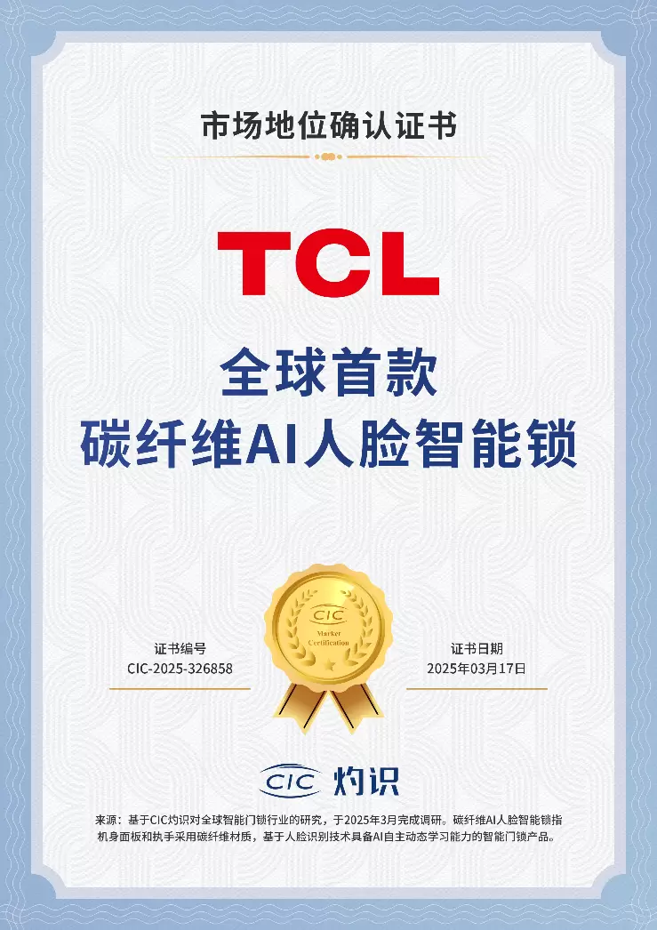 TCL荣获CIC灼识“全球首款碳纤维AI人脸智能锁”的市场地位确认