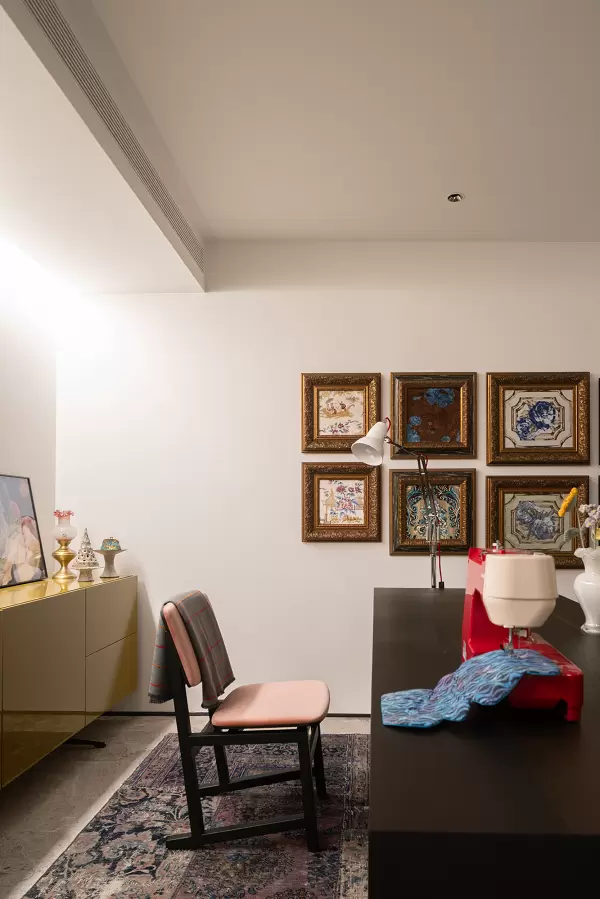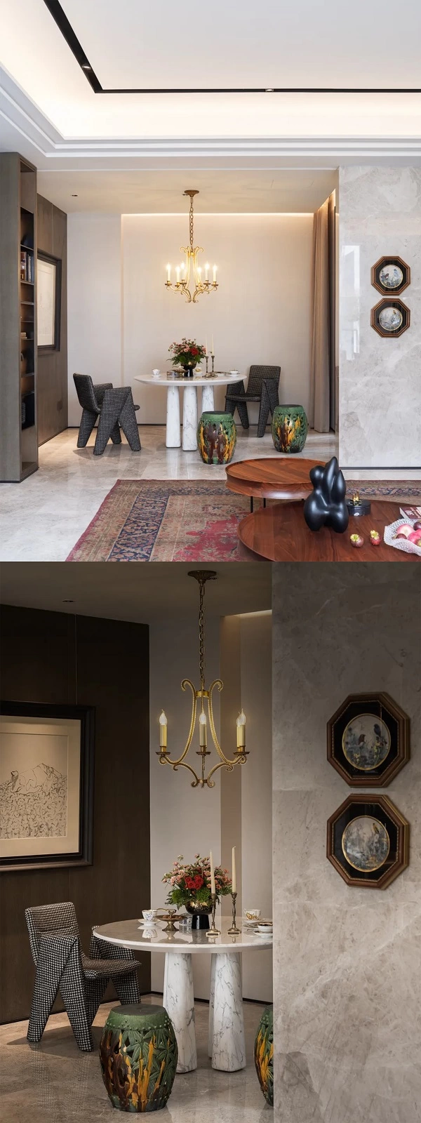 角落里通体白色石材的四喜餐桌轻盈纯净,宛如雕塑一般默然伫立。民国鼓墩的明艳、黑白格千鹤椅的碰撞、中古花鸟画的斑驳,让艺术气息在这个空间自由生长。