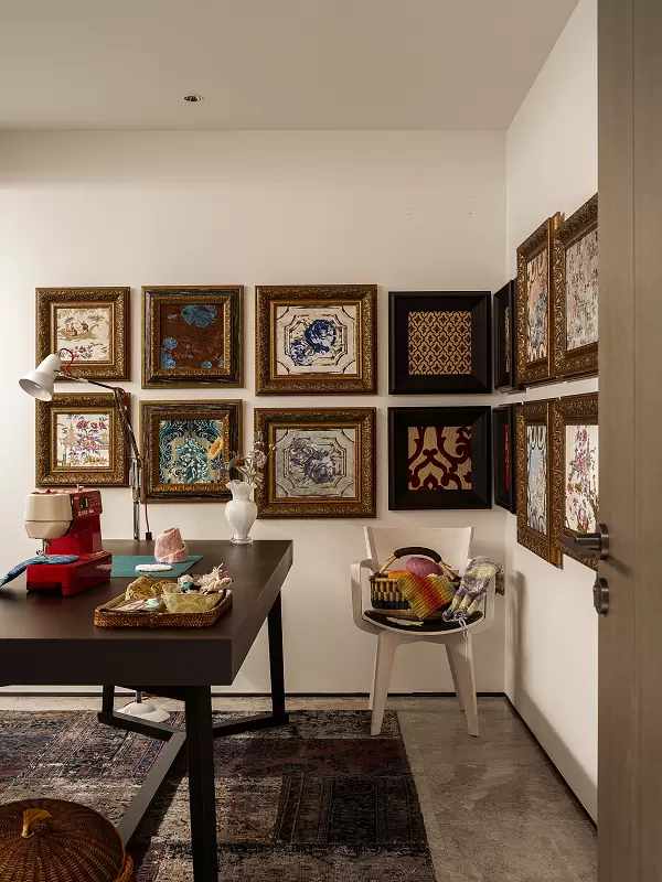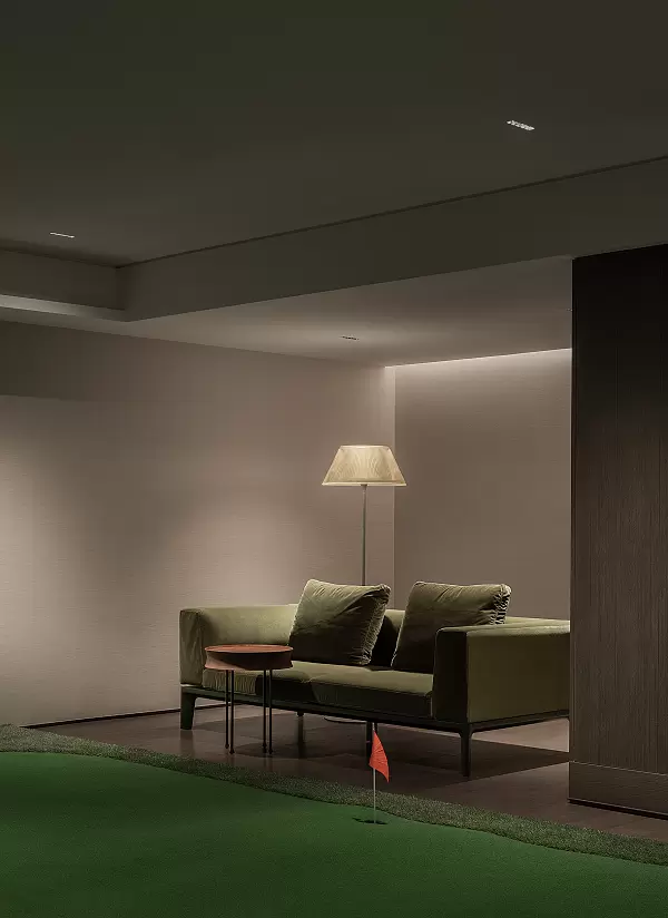 与车库直连的负二层,被打造成全然私属的“精神疗愈所”:室内果岭舒展绿意,音乐空间流淌旋律,布艺工作室里装裱着肌理各异的织物作品,私藏着别有意趣的中古香炉、煤油灯、人物雕塑……