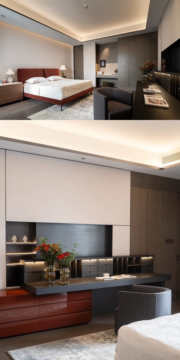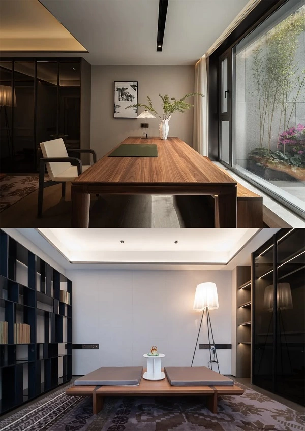 位于一角的客房变身多功能房,伏案于达摩桌,临窗的视野带来开阔的心境。燕尾茶几化身为榻,东方意蕴在此间悄然流动。