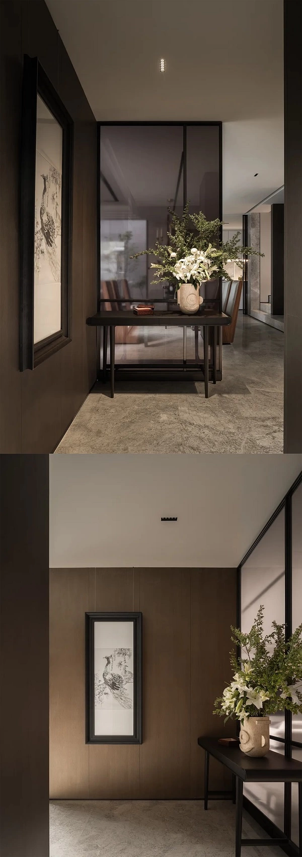整个别墅建筑空间和庭院的比例适中,室内面积、尺度也是刚刚好的状态。推开合院的大门,穿过一处庭院入户,玲珑书桌化身玄关台,浑圆石制花器与白孔雀画作奠定雅致基调。