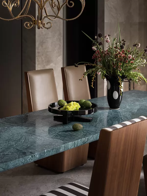 最浓烈的一笔,来自JohnPawson系列的夏荷石长桌——天然石纹肌理与极简体块、以及精巧节制的细节共同谋和,如雕塑、建筑般的美感,在肯定与松弛之间准确地存在着。