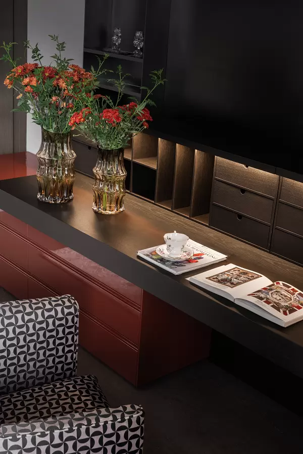 二层的主卧房更偏向女性空间,霁红色大雅书桌兼作妆台,与暗红无忧床呼应,半圆形逍遥扶手椅柔化了空间的棱角。布料、木材与石材等不同材质的层次叠搭,让这个私密空间包裹感与质感并存。