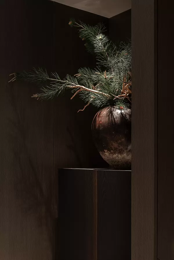 二层起居室中庭,一尊漆器花瓶静立,松柏枝影婆娑,悄然注入东方禅意。