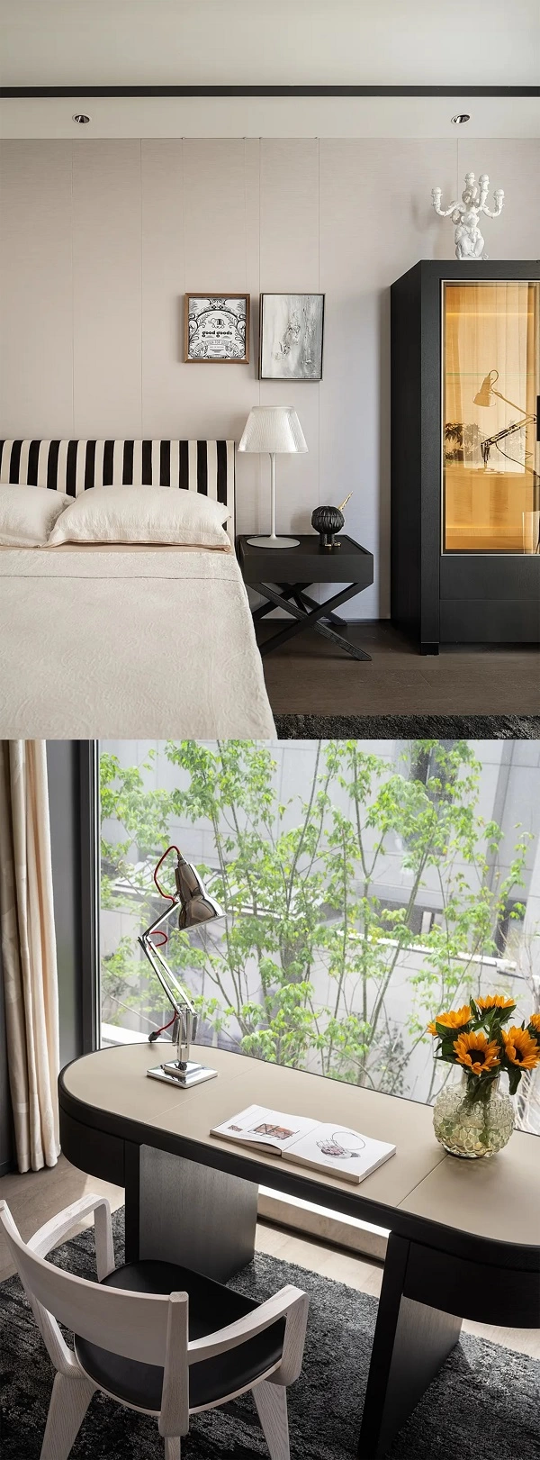 同层的儿童房内,黑白基调的长宁床率性而置,金锁书桌与小蔓椅活泼相映,勾勒出一方鼓励自由探索与成长的天地。