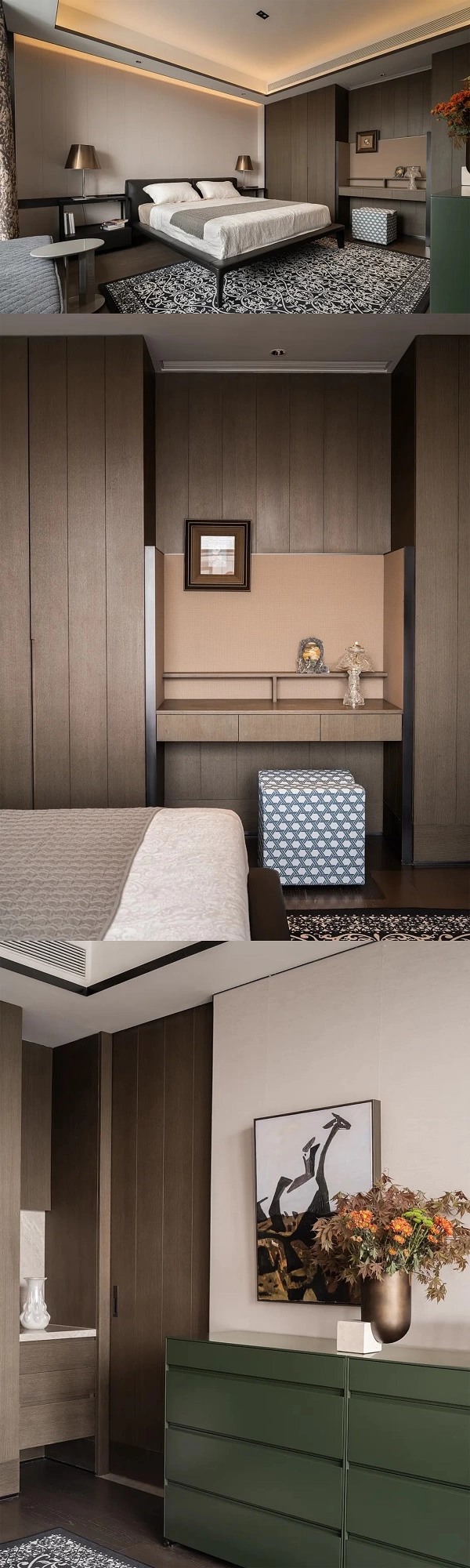 三层仅有的一间卧房,则以黑白灰为基底,更具有男性空间特质。墨绿锦盒柜灵动点缀,诠释内敛的力量感。整体设计摒弃冗余,自在丰盈悄然流露。