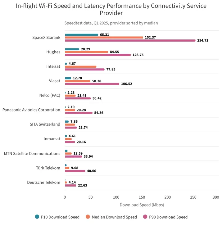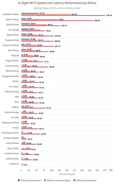 根据最新数据,2025年第一季度机载网速排行榜中,夏威夷航空和卡塔尔航空表现最为亮眼。这两家航空公司的峰值网速分别达到276Mbps和236Mbps,常态网速中位数维持在161Mbps和120Mbps,最低网速也有57Mbps和15Mbps。