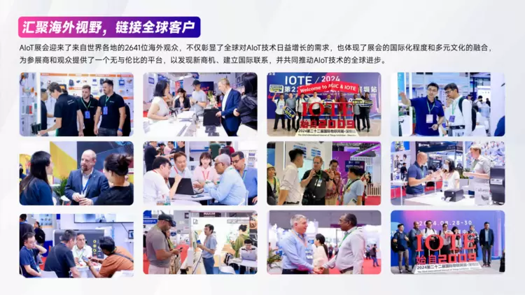 汇聚海外视野,链接全球客户:IOTE展会迎来了来自世界各地的2641位海外观众,包括国际知名的科技公司、创新初创企业以及行业研究机构等展商。不仅彰显了全球对AIoT技术日益增长的需求,也体现了展会的国际化程度和多元文化的融合,为其提供发现新商机、建立国际联系的平台,并共同推动AIoT技术的全球进步
