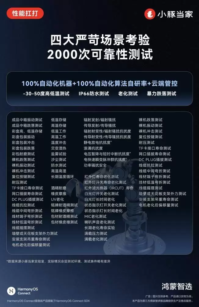 在鸿蒙智选"零妥协"品控体系下,每一台鸿蒙智选 小豚当家室外摄像头都需要经历-30℃-50℃高低温测试、防水测试、老化测试及暴力跌落测试等四大严苛场景考验,前后接受2000次可靠性测试的生死淬炼。
