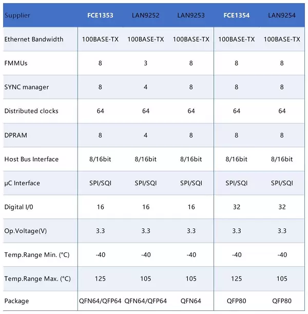 Microchip的LAN925X系列芯片在业内一直独领风骚,但是这种情况随着方芯半导体公司2024推出的全兼容芯片产品而得到改观。方芯半导体推出的FCE1353/1354芯片既兼容Microchip的这三款产品,同时在性能和功耗方面又有更优表现,尤其是价格方面,FCE1353/1354较LAN9252/9253/9254优势明显。产品一经推出,便被业内多家大厂测试使用,目前已进入大规模量产阶段。
