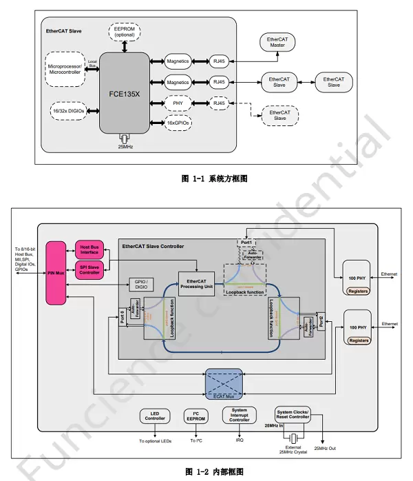 FCE1354可原位替代Microchip LAN9254,与FCE1353具有相同功能和特性。芯片同时具备包括LAN9252和LAN9253的新增功能,它支持多个过程数据接口SPI/SQI、HBI和数字IO。其中32个数字信号可以由EtherCAT主站控制或监控。FCE1354相较于FCE1353增加了更多的I/O引脚,并且在某些HBI模式下可能具有更高的性能。此外,LAN9254在数字I/O模式下也提供了更多的信号控制能力。可满足客户对周期时间、集成和系统级成本的要求,为系统开发人员提供了一种更加经济高效的EtherCAT设备解决方案。
