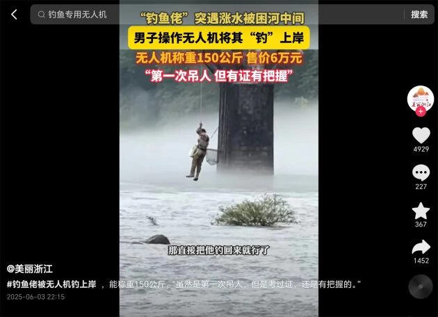 6月初,浙江丽水发生突发险情,一名钓鱼爱好者在暴涨的河流中被困,情况万分危急。由于水流湍急,传统救援手段无法及时施救且风险巨大。危急关头,无人机技术为这场生死救援提供了新方案。