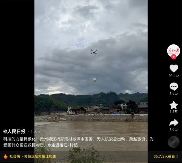 这两次救援使用的并非大疆最新发布的运载无人机DJI FC100,而是大疆 T100 农业无人机。尽管如此,这一类应用场景依然凸显了无人机在极端条件下的重要作用,尤其是紧急抢险时刻,无人机展示了其独特的多元价值。对于榕江的无人机救援情景,人民日报还发布了《科技的力量具象化!》的短视频,获得60余万点赞。