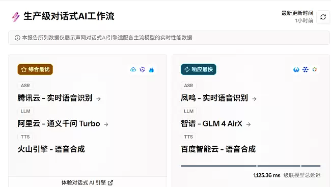 AI模型评测平台主要分为“仪表盘”与“竞技场”两项功能,在“仪表盘“中官方推荐了对话式 AI 引擎适配后综合最优、响应最快的级联模型组合。例如,截止目前,综合最优推荐级联模型组合为腾讯云-实时语音识别+阿里云-通义千问 Turbo+火山引擎-语音合成。响应最快推荐级联模型组合为凤鸣-实时语音识别+智谱-GLM 4 AirX+百度智能云-语音合成,级联模型总延迟为1125.36 ms。