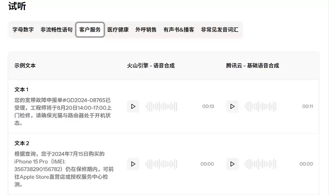 此外,“竞技场”的 TTS-语音合成对比中,还提供了预设的语音合成测试语句,反映多种场景下(字母数字混合、非流畅性语句、客户服务、医疗健康、外呼销售、有声书&播客、非常见发音词汇)不同模型的语音合成质量,并且支持试听。