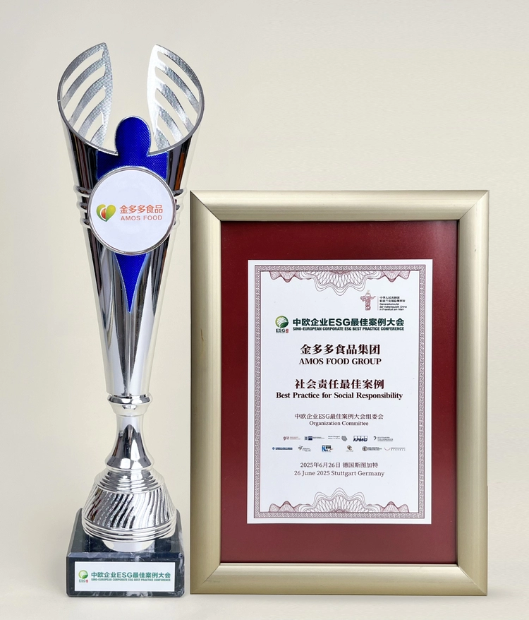 6月26日上午,在德国斯图加特举办的2025第二届中欧企业ESG最佳案例大会主论坛上,金多多食品集团(下称“金多多”)荣获“社会责任类别最佳案例”奖项,金多多创始人马恩多登台并作荣誉演讲,分享其在ESG方面的实践与成果。