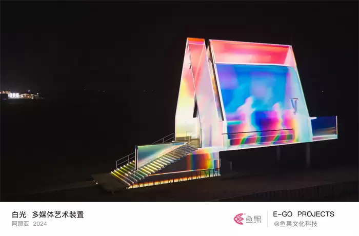 自 2021 年首届阿那亚戏剧节启幕,鱼果文化科技便以数字艺术为桥梁,在阿那亚的海岸线上开启了与戏剧节的深度共生。打造梦幻的阿那亚礼堂灯光秀,通过公共艺术的光影叙事持续拓写体验边界,为这场海边文化盛会注入多元可能。
