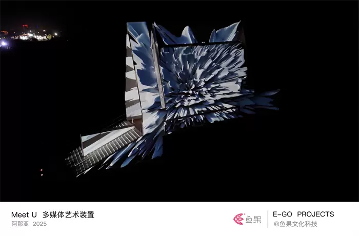 2025阿那亚戏剧节期间,鱼果再度于阿那亚礼堂呈现全新多媒体装置作品《Meet U》,在礼堂穹顶构建超现实的星际邂逅,隐喻人类对未知的探索。
