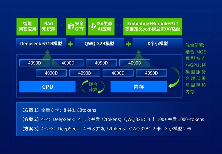 深信服AI创新平台率先发布商业化4090D起步运行含671B的端到端AI应用场景。也就是说,用户只需要用8卡的4090D即可运行满血版671B的端到端AI应用场景,满足大参数、小参数模型在更低硬件和显卡上的部署,让用户在AI建设起步阶段,能以更低成本体验各类模型的效果,选择出最适合自身的模型。