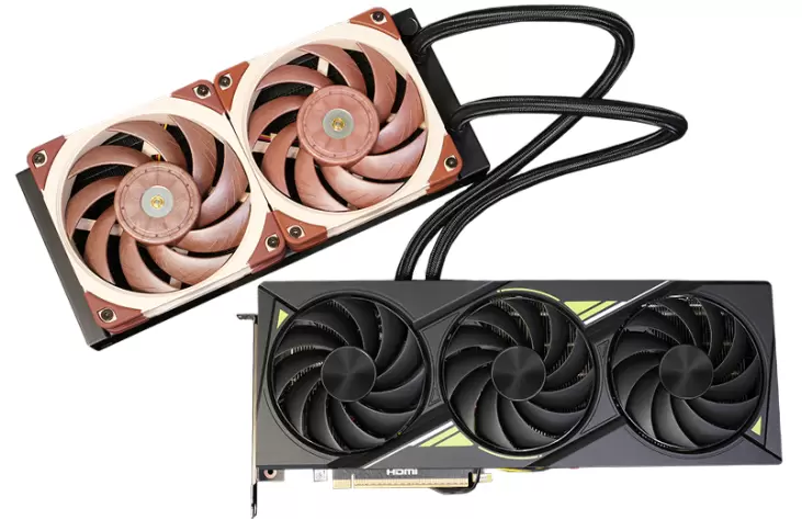 RTX 5080 Hydro LC采用三风扇PCB散热模组,直接连接240mm冷排。该冷排配备棕色猫头鹰高风量NF-A12x25 ULN风扇,专为GPU散热优化。这些风扇以固定1200转/分钟的转速运行,仍可提供55.7 CFM(立方英尺/分钟)的风量。相比传统显卡散热方案,这种混合式散热系统能显著提升散热效率和使用寿命,但也会大幅增加成本。