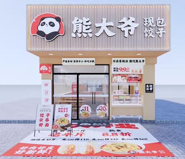 熊大爷本轮200家+新店并非简单复制,而是品牌形象的系统升级。门店摒弃过去强商业属性的红色主视觉,采用“原木色系+熊猫元素”设计,搭配开放式厨房和暖光氛围。“明厨亮灶”让顾客清晰见证手工包制全过程,食品安全可视化,更增添烟火气与信任感;自然、温暖的视觉语言,营造温馨、治愈的用餐氛围,让消费者感受家一般的舒适。