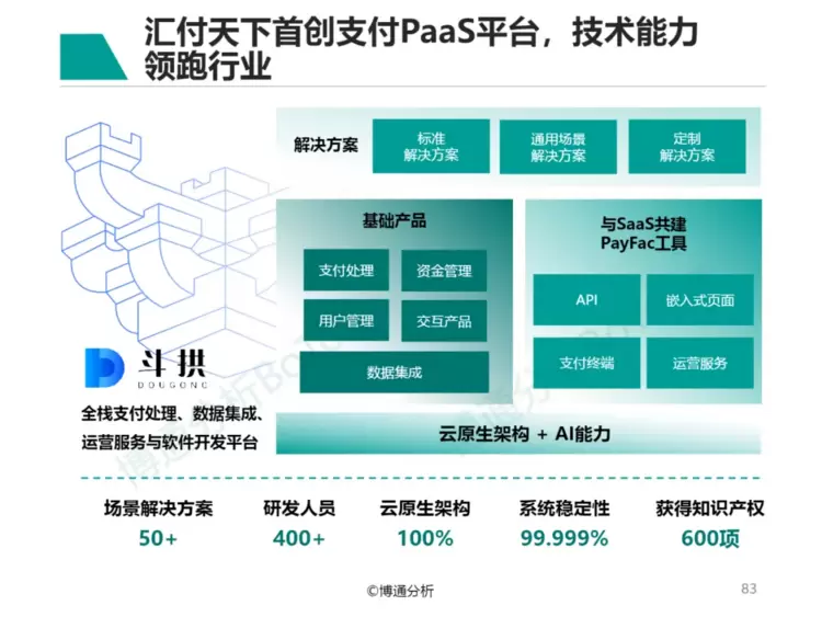 博通分析认为,汇付天下首创的斗拱支付PaaS平台,技术能力领跑行业,基于汇付的100%云原生架构与AI能力,提供支付处理、资金管理、用户管理、交互产品、数据集成等基础产品,并能与SaaS共建API、嵌入式支付、支付终端、运营服务等PayFac工具,提供50+场景解决方案,系统稳定性达到99.999%。