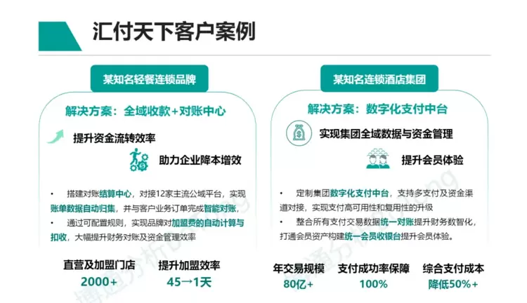 汇付天下作为国内数字化支付引领者,为全球企业收款、数据集成和资金管理提供平台服务,致力于成为数字生态的连接者。公司聚焦于数字化、国际化两大战略方向,面向各类行业场景提供一站式数字化解决方案,助力上万家行业客户与千万中小微商户实现降本、提效、增长的转型目标。