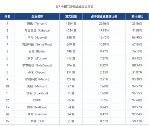 AI作为技术密集型产业,其学术研究也高度集中于头部企业,中美两国TOP15企业的发文集中度均超过99%。