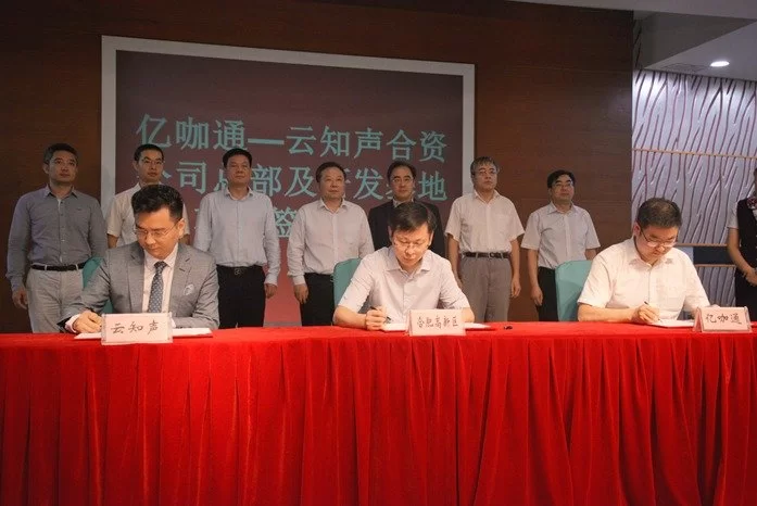 合肥市高新区管委会副主任刘登银(中),云知声 CEO 黄伟(左),亿咖通科技 CEO 沈子瑜(右)