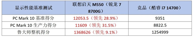 从整机综合性能来看,采用锐龙7 8700G的联想启天M550在PC Mark 10基准得分上领先配备酷睿i7 14700的竞品约28.9%的性能,在PC Mark 10生产力场景下,也领先竞品31.5%的性能