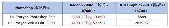 再来看商用场景中使用较多的图片与视频处理与剪辑工作,我们在UL Procyon分别测试了Photoshop和Premiere Pro。采用锐龙7 8700G的联想启天M550在Photoshop场景中的综合得比为6658,比采用酷睿i7 14700竞品的成绩领先近14%;而在更考验显示性能的视频处理中,拥有Radeon 780M优秀集显的联想启天M550领先竞品约58%,可见强大的图形性能在实际应用中的重要性同样迫切。