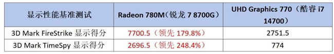 在显示性能上,锐龙7 8700G配备了性能强大的Radeon 780M集成显卡,它拥有12CU与2700MHz的频率,在3D Mark图形性能测试上,Radeon 780M与酷睿i7 14700搭载的UHD Graphics 770核显相比,FireStrike显示得分更是达到后者的279.8%;TimeSpy显示得分达到后者的348.4%