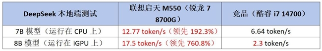如今,越来越多的行业专用模型都将部署在端侧,以满足企业数据保密需求,我们同样在联想启天M550和竞品上来看AI端侧表现。除了运行在CPU之上,我们还可以借助显存的灵活配置,在联想启天M550和竞品上部署Deepseek。可以看到,如果以CPU运行7B参量的Deepseek,锐龙7 8700G领先对手近两倍;而在iGPU上运行8B参量的Deepseek,两者的差距达到惊人的7.6倍。