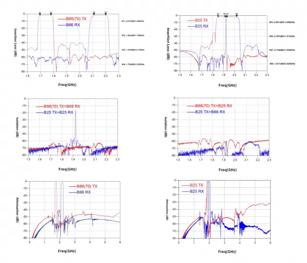 B25 TX带内插损典型值小于2.6dB,B25 RX带内插损典型值小于2.8dB,B25的接收和发射隔离度典型值分别达到58dB和56dB。