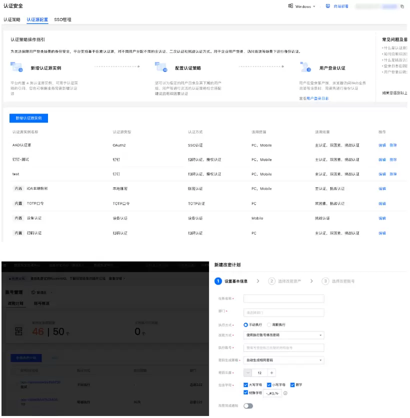 ●账号密码收敛:用户MFA认证,资源定期改密,运维端通过身份认证的安全配置实现多因素认证,基于自动化资源改密任务确保账密可控。