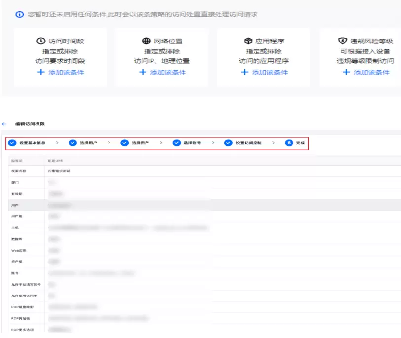●权限精细管控:启用动态验证,限制访问来源,基于云堡垒机零信任模式的动态授权访问策略,根据用户行为、设备状态、网络环境实时评估风险,阻断非法来源;用户、资产、账号、权限和高危命令5层授权模型,管控资源服务安全稳定。