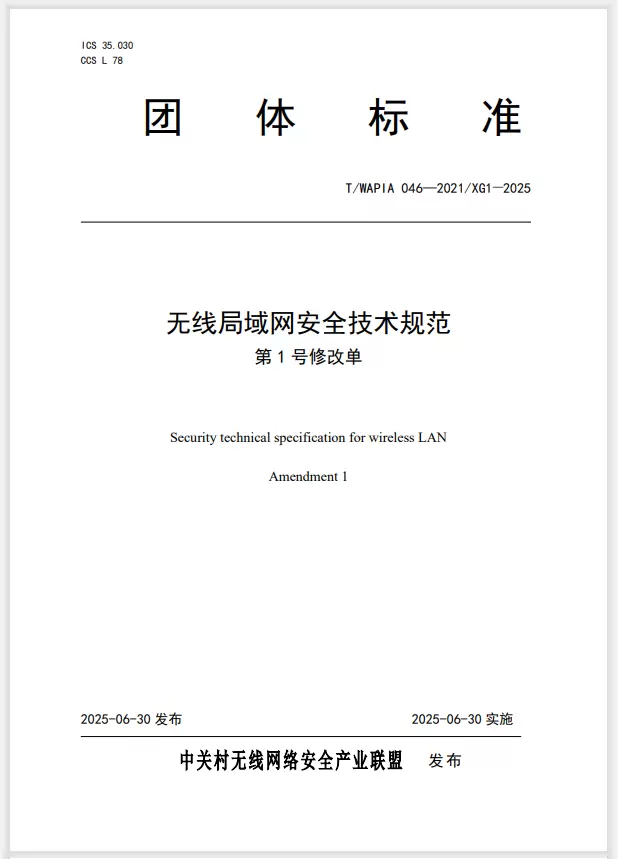 日前,中关村无线网络安全产业联盟(WAPI产业联盟)发布了T/WAPIA 046—2021/XG1—2025《无线局域网安全技术规范 第1号修改单》团体标准,本标准的发布,将助力产业加速升级,为用户提供安全、便捷高效的无线体验。