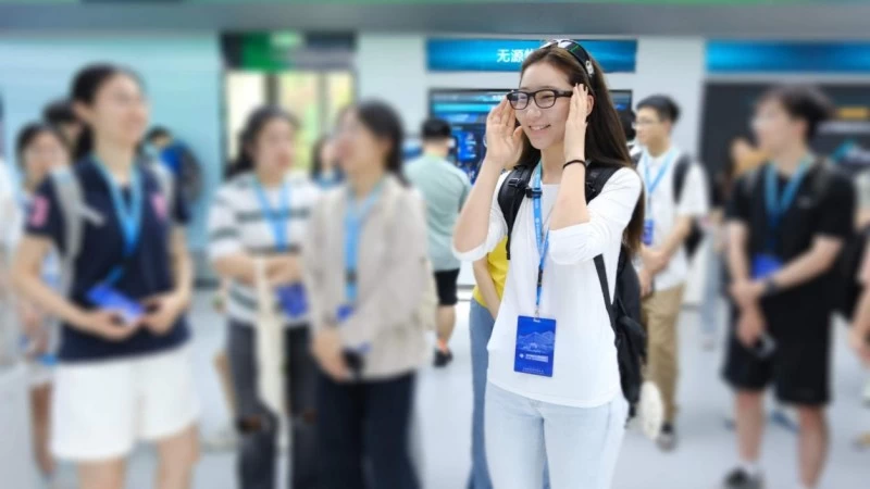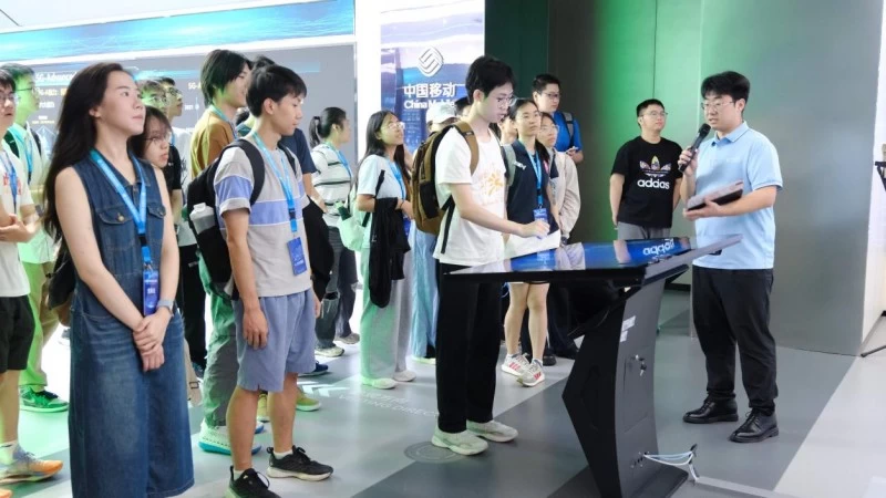在中国移动国际信息港的协同创新基地展厅,同学们近距离体验了算网大脑、智能算力集装箱、九天基座大模型等前沿应用成果,开启了一场“看得见、摸得着”的技术探索。“展厅即课堂,展品即教材”,同学们通过操作AI眼镜的实时翻译功能、指挥机器狗执行巡检任务,亲历了“大数据从技术到场景”的惊险一跃。北邮学生张苏丹同学在体验AI眼镜等创新产品后深有感触后感慨:“试戴AI眼镜时,译文秒速投射到现实视野,着实让我震撼了一把,让我对未来可以参与到‘技术赋能生活’的研发探索有了更大的期待。”