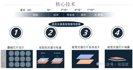 与传统图像传感器仅使用红绿蓝(RGB)三个波段不同,超宽光谱图像传感器能够覆盖从紫外、可见光、近红外、中红外甚至远红外的多个波段,获取数十至上百个光谱维度信息。其技术路径基于先进的多层堆叠芯片工艺,通过在同一像素位置捕捉多段光谱,实现对物质成分、深度、温度、湿度等物理属性的图像级融合感知。