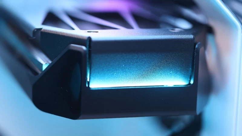 首先引入眼帘的就是3把印有撼讯,以及暗黑犬logo的日系双滚珠轴承风扇,尺寸达到9cm。提供充足风量的同时,由于降低摩擦系数,寿命及噪音表现都有明显改善。搭配智能启停功能,待机或低负载情况下可以做到“0”噪音,即便在烤机这种极限负载场景,人位噪音也能低至40分贝,效果跟戴了降噪耳机也差不多。愿意折腾的话,还可以手动精调风扇曲线。