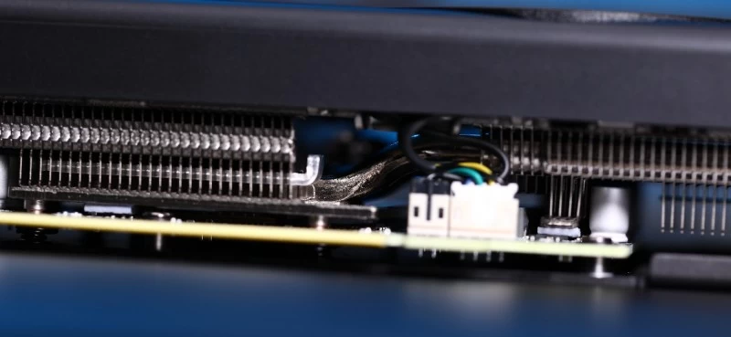 从底部位置可以稍微直观地看到显卡内部散热结构,直列式密集排列的散热鳍片几乎覆盖了整张卡。配合4根6mm镀镍铜管,对拥有4nm先进制程工艺和甜品级属性的撼讯RX 9060XT暗黑犬16G来说,散热规格是相当富裕了。以实际的温度表现来看,哪怕双风扇应该也能满足散热需求。该说不说,撼讯在散热这块的用料上是真得很大方。