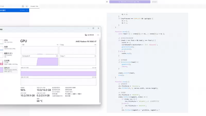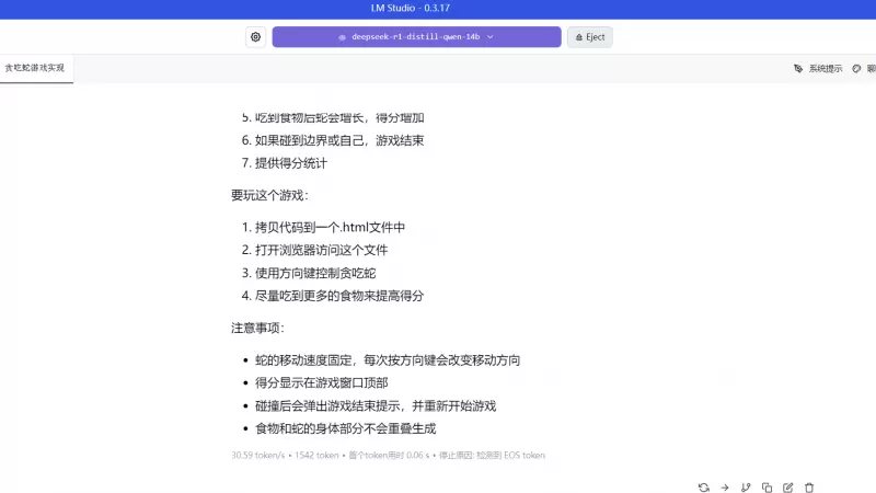 毕竟是一张16G显存的卡,常规测试放后面,先来看看大显存的优势。本地部署qwen-14B模型并让它写一份贪吃蛇游戏,可以看到显存占用量达到10.2G,速度为30.59token/s。如果只有8G显存的话,虽然可以通过借用内存空间来取巧,但响应速度也会明显降低。
